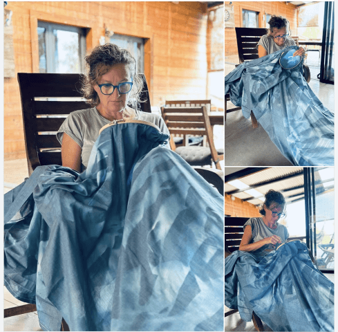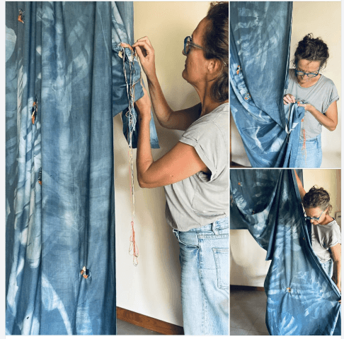 Au cœur de sa pratique, le végétal n’est pas un motif, mais une présence active, à la fois sujet, médium et matière. Karine travaille avec la plante elle-même : elle la dépose, la frappe, la laisse imprimer sa couleur et sa forme sur le support. Par le tataki-zomé, le cyanotype, la macération ou la broderie, elle compose avec le temps et la transformation naturelle. Ses œuvres deviennent les empreintes sensibles d’une cohabitation entre l’humain et le vivant.