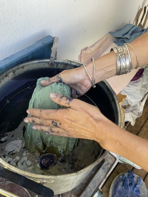 Valérie travaille avec ce que la nature lui confie : une peau d’oignon, des feuilles tombées, un fragment de tamarinier, une racine que la terre lui tend. Elle connaît la patience du végétal, son obstination à transmettre. Ses pigments naissent d’ici, de l’île, mais aussi d’ailleurs — Madagascar, où elle a vécu douze ans, et où elle revient encore, guidée par une fidélité profonde envers les familles artisanes. Cette île, qu’elle porte comme une sœur, nourrit son geste et élargit sa palette. L’indigo venu de l’Inde complète ce paysage de couleurs migrantes, voyages intimes entre îles et continents.