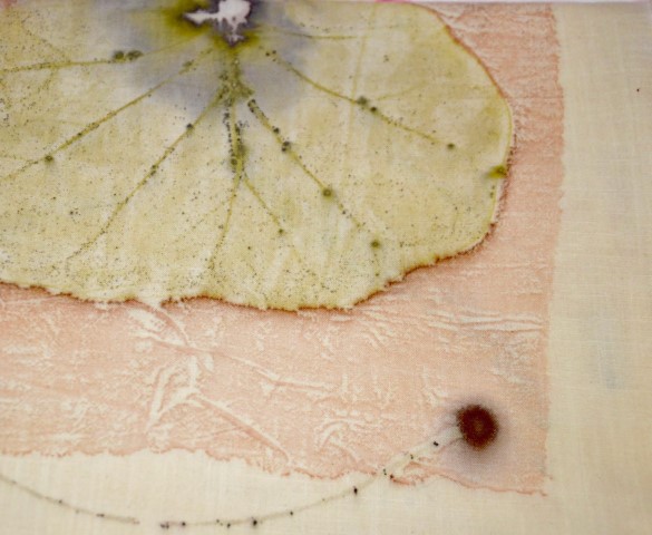Dans son travail, chaque plante est une rencontre. Certaines feuilles restent intactes, pressées contre le tissu pour révéler l’empreinte exacte de leur nerf, de leur souffle. D’autres bouillent, se dissolvent, s’abandonnent dans des bains de chaleur et de patience. Les étoffes — étoles, écharpes, sacs, vêtements, deviennent des paysages de fibres où la lumière dépose sa propre mémoire. Valérie dialogue avec des chercheurs, des artisans, des compagnies de danse et de théâtre ; elle teint des costumes, accompagne des projets, glisse ses couleurs dans des créations intimes et collectives.